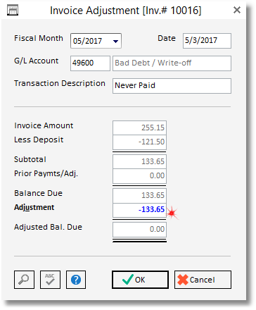 - In the Adjustment field, type in the amount that you are writing off, typically this is the same as the Balance Due; however, the Adjustment amount should be a negative amount