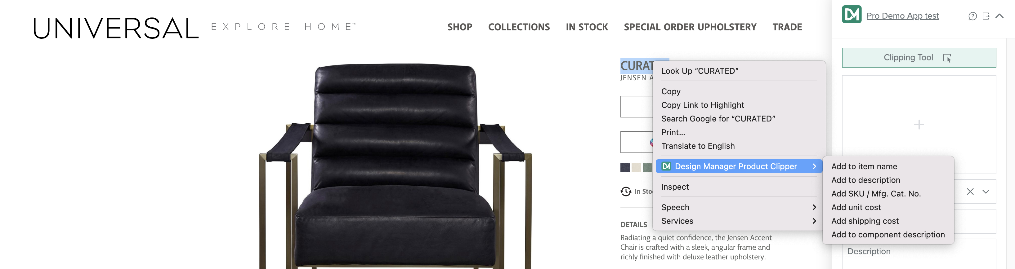 - Manually: You can manually click and select the text (using your mouse) on the site that you wish to clip the details of, then right click and select the field of the Product Clipper to include the selected text in.