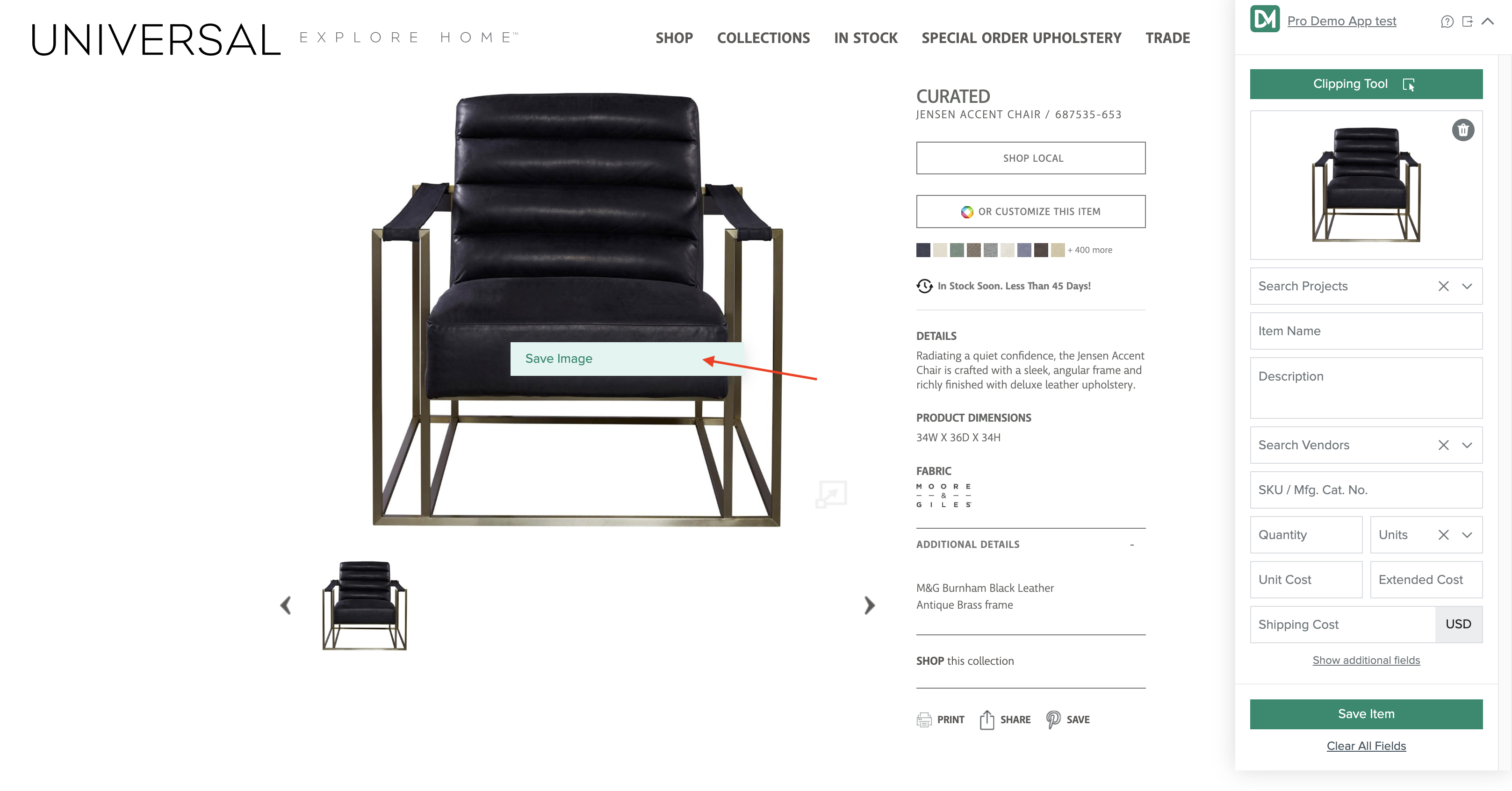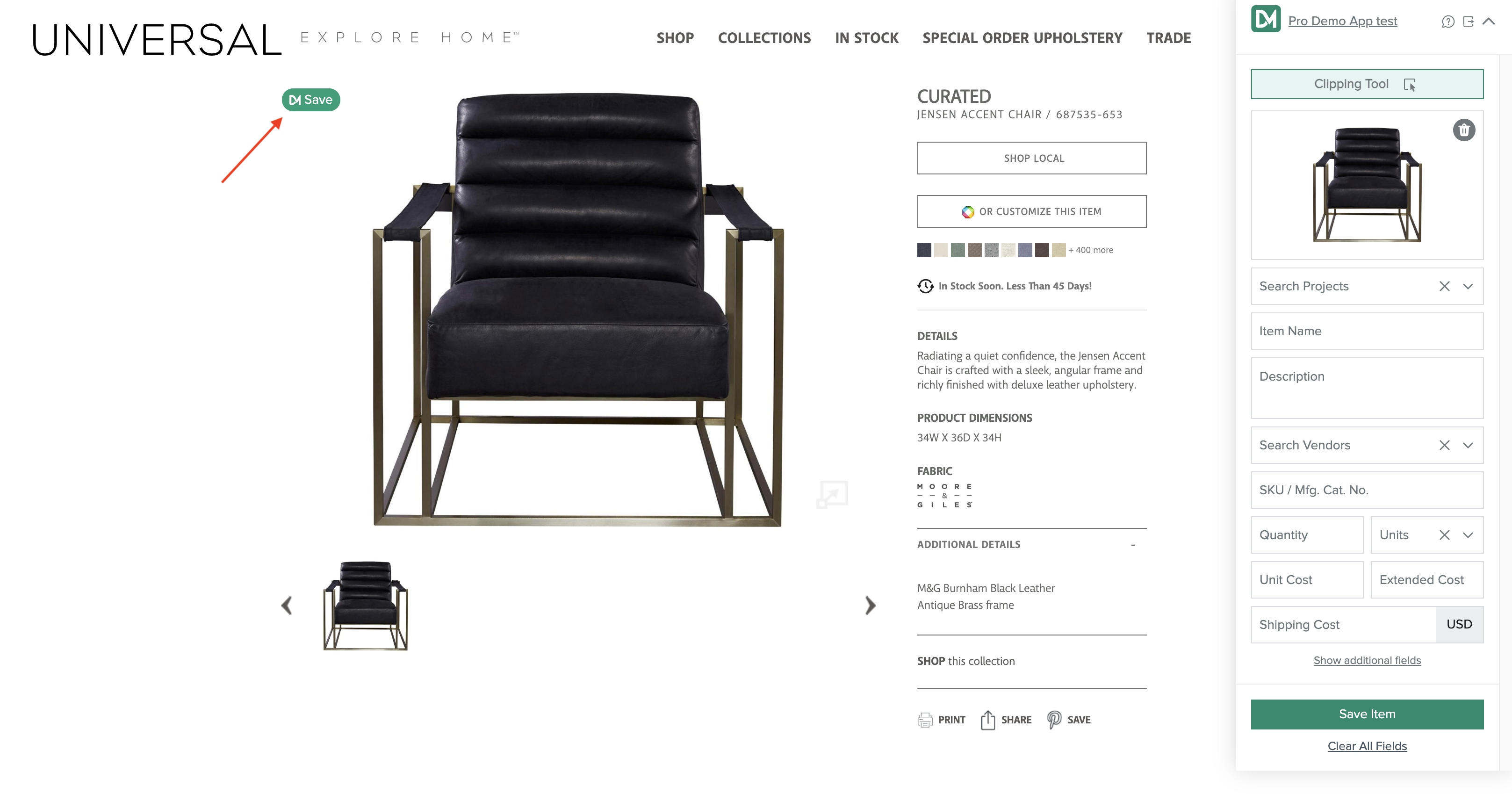 When using the Product Clipper, you can clip as much or as little detail as you wish to save about your item; not all fields are required. ONLY an Item Name OR Description is required to save the entry. Once you have entered your details, click on the Save Item button at the bottom of the Product Clipper to save. The saved entry will now show on your Pro Cloud Whiteboard.
